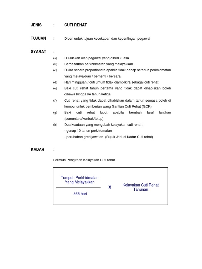 Pengiraan Kelayakan Cuti Rehat : Pekeliling perkhidmatan bilangan 14 tahun 14 tahun 2010.. Kemudahan ini juga boleh dinikmati oleh guru sandaran/interim dan juga guru kontrak. Pemberian award wang tunai gantian cuti rehat adalah berdasarkan 1/30 daripada gaji akhir diterima, tertakluk. Kadar cuti rehat tahunan bagi pegawai perkhidmatan awam yang dilantik mulai 1 januari 2009 adalah seperti berikut Anda juga boleh menggunakan butang hasil pada alat bantuan paparan untuk melaksanakan proses kelayakan. Anda dikehendaki menentukan metode pengiraan kelayakan cuti bagi setiap kakitangan berdasarkan tempoh perkhidmatan.