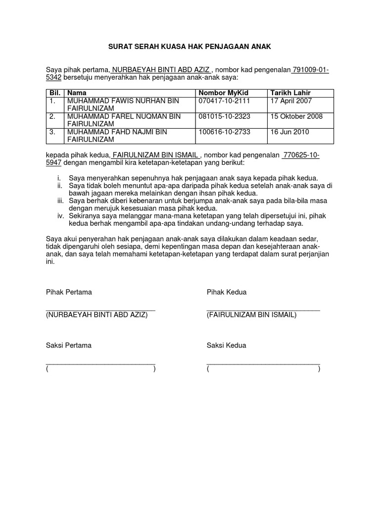 Surat Hak Penjagaan Anak : Sekarang ini, apa yang dilakukan atas budi bicara.. Ikhmal hisham perjelas surat lantikan anak. Contoh surat perjanjian hak penjagaan anak. Sekiranya ibu berkelakuan tidak baik dan buruk secara terbuka dan keterlaluan. Jiwa anak wajib dijaga agar terhindar daripada kemudaratan dan kebinasaan. Rina rosdiana ratu ular tempat, tanggal lahir :