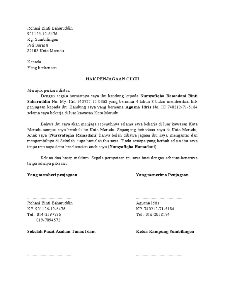 Hadhanah from image.slidesharecdn.com Bahkan surat ini termasuk kedalam surat resmi sehingga harus dibubuhi tandatangan yang sah. Sekiranya ibu berkelakuan tidak baik dan buruk secara terbuka dan keterlaluan. Sekiranya pasangan suami isteri bercerai dan mereka mempunyai anak lelaki atau perempuan yang masih kecil (bayi) dan memerlukan penjagaan dan pengasuhan, maka yang lebih berhak ke atas pengasuhan anak tersebut ialah ibunya. Hak penjagaan anak kecil juga dikenali sebagai hadhanah. Contoh surat rasmi hak penjagaan anak surat 25 mp3 & mp4. 6:44 cnn indonesia 3 195 241 просмотр. Surat serah kuasa hak penjagaan anak. Peraturan am mengisi dokumen perjanjian via www.slideshare.net.
